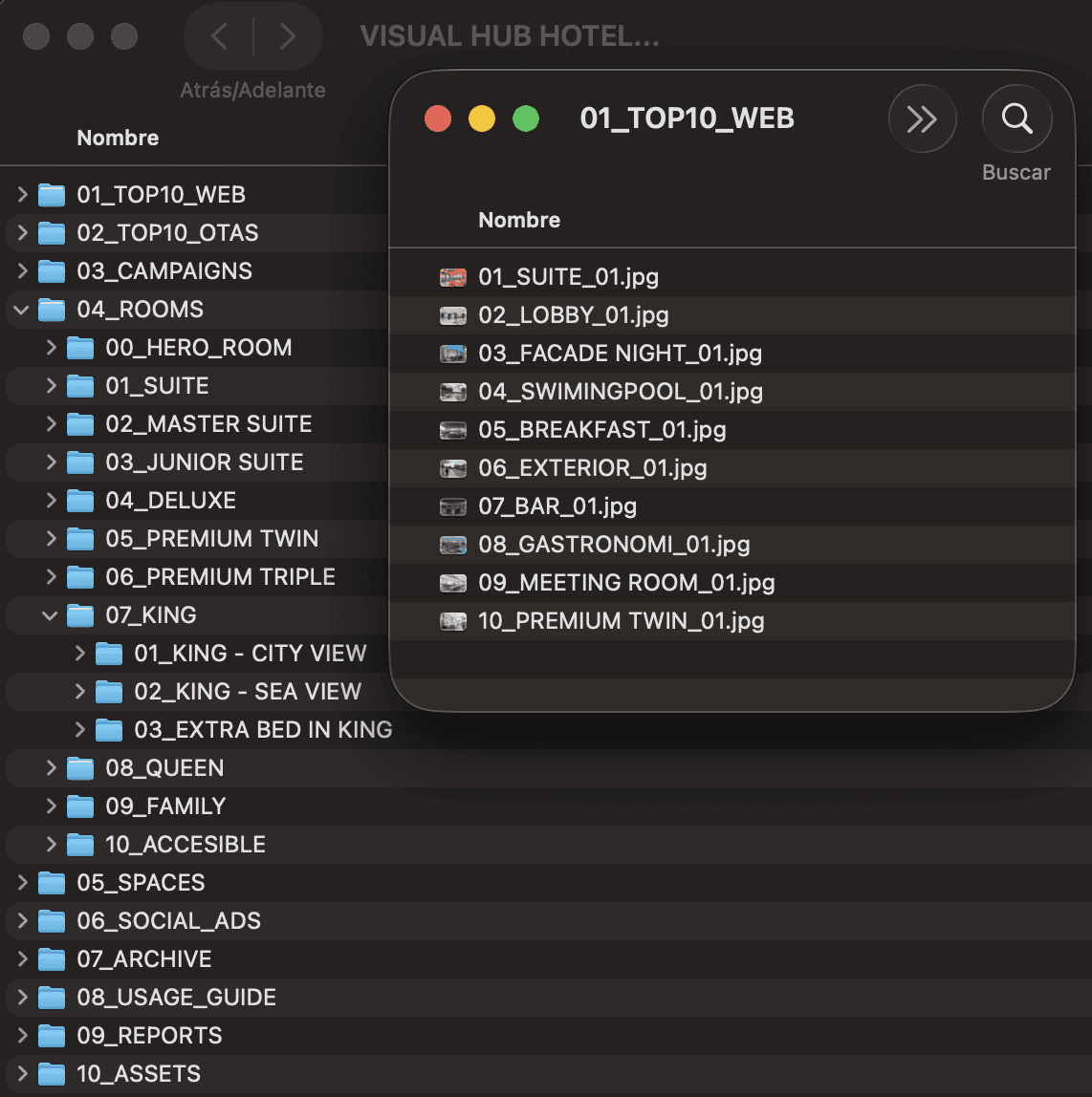 Visual Hub centralizado: biblioteca ordenada por hotel/canal/espacio/uso